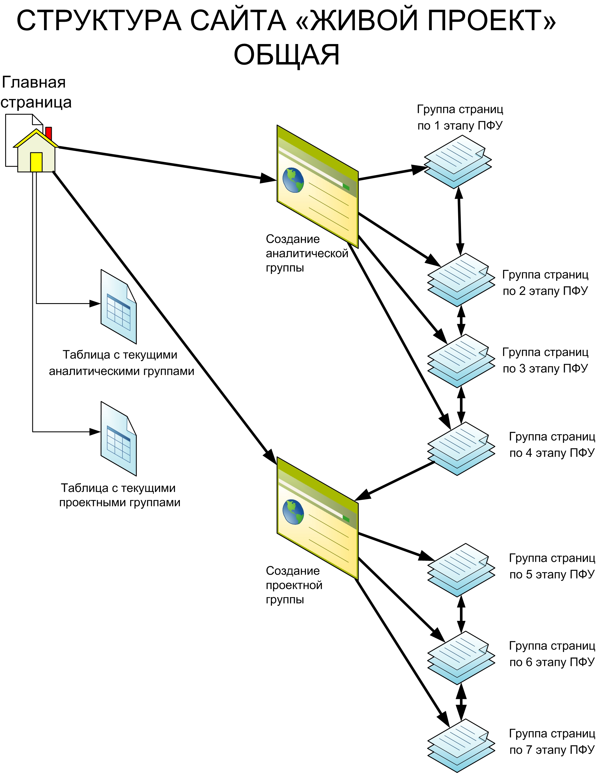 На главной странице видны все открытые обсуждения и все запущенные проекты. Вошедший на сайт может сам выбрать, где он может приложить свои силы - или анализировать и обсуждать (1-4 этапы ПФУ), или внедрять проекты в жизнь (5-7 этапы).